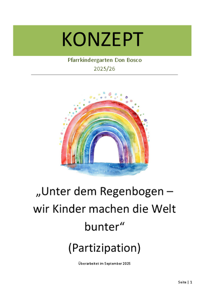 Der Regenbogen steht symbolisch für Toleranz, Gemeinschaft, Individualität und Hoffnung. Im pädagogischen Alltag nutzen wir dieses Bild, um Werte wie Zusammenhalt, gegenseitige Wertschätzung, Mitbestimmung, Mitgestaltung, Mitverantwortung und Vielfalt erlebbar zu machen. Jedes Kind bringt seine eigene Persönlichkeit, seine Interessen, Ideen und Fähigkeiten mit – gemeinsam entsteht daraus ein lebendiges Miteinander.