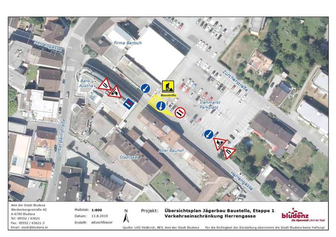 Bevor es soweit ist, gilt es allerdings, noch einiges zu erledigen. Vor allem die Infrastrukturleitungen, die in der Herrengasse unterirdisch verlaufen, müssen verlegt werden. Bekanntlich ist geplant, dass die Jäger Firmenzentrale eine zweistöckige Tiefgarage errichtet, wobei das erste Untergeschoss als öffentliche Tiefgarage genutzt wird. Dazu wird auch die Herrengasse bis zur städtischen Liegenschaft unterbaut, um so zu einem späteren Zeitpunkt ohne neuerliche Straßenbaustelle die Tiefgarage auf dem städtischen Gelände erweitern zu können. Die Herrengasse wird während der Bauzeit der Firma Jäger über das alte Bauhofareal als Einbahn umgeleitet.