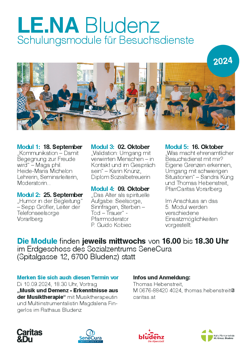 Ein paar Stunden Zeit für andere aufbringen? Um älteren, einsamen Menschen ein wenig mehr gesellschaftliche Teilhabe zu ermöglichen und so den Zusammenhalt zu fördern, bietet das Projekt LE.NA (Lebendige Nachbarschaft) der PfarrCaritas gemeinsam mit der Pfarre Heilig Kreuz, der Stadt Bludenz und dem Pflegeheim Senecura einen Besuchsdienst an. Dazu gibt es eine Infoveranstaltung für Interessierte in der Alpenstadt.