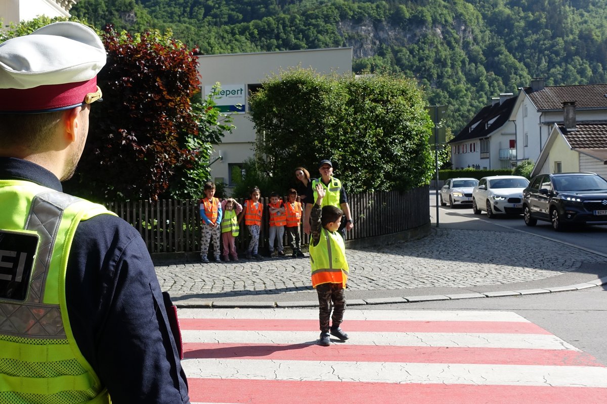 Die Bludenzer Stadtpolizist*innen sind im Einsatz in den städtischen Kindergärten. Sie vermitteln, wie man einen Schutzweg richtig überquert, was man macht, wenn der Ball plötzlich auf die Straße rollt und worauf man im Straßenverkehr allgemein achten muss.