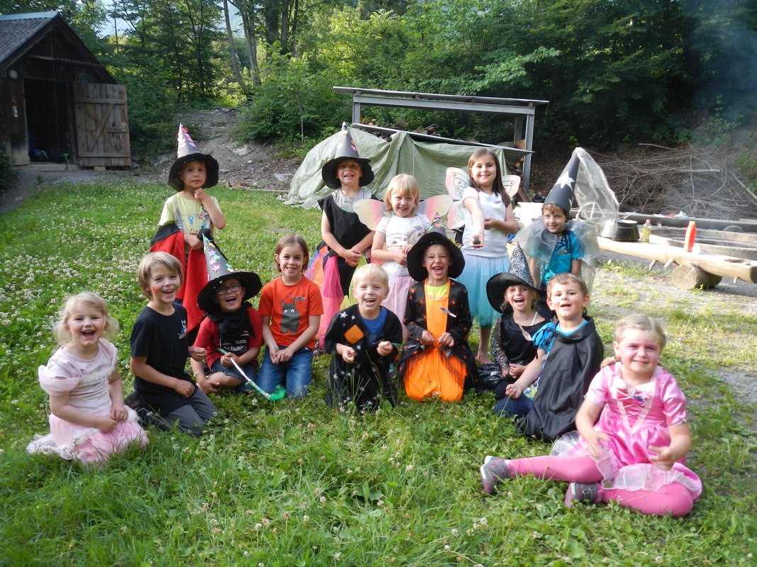 So haben die Kinder viel über Wildkräuter erfahren, experimentierten mit Löwenzahn, kochten Brennesselchips, machten leckeren Holundersirup und lauschten der Geschichte des Gänseblümchens und seinem goldenen Herzen. Das Highlight wad dann das Hexen und Zauberfest. Alle durften sich verkleiden und sich einen Hexen –oder Zaubernamen ausdenken. Da fand man den Hexer Schlangengift, die Regenbogen-Hexe, Hexe Lückenzahn und viele mehr. Für die acht Großen die im Herbst in die Schule kommen ging der Spaß noch weiter. Sie durften nach weiteren Spielen und Geschichten mit den Kindergarten-pädagoginnen Bianca und Monika im Zelt im Wald übernachten. Am Morgen gab es noch ein gemeinsames Frühstück und dann wurden alle mutigen WaldLüxe abgeholt. Es war ein zauberhaftes Fest und eine hexisch tolle Nacht mit den WaldlLüxen!