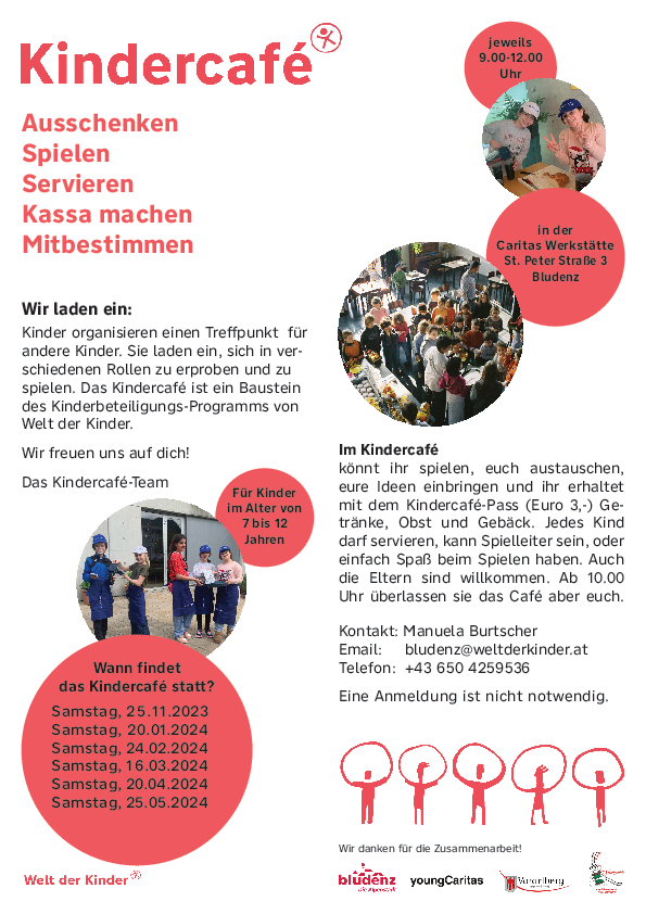 könnt ihr spielen, euch austauschen, eure Ideen einbringen und ihr erhaltet mit dem Kindercafé-Pass (Euro 3,-) Getränke, Obst und Gebäck. Jedes Kind darf servieren, kann Spielleiter sein, oder einfach Spaß beim Spielen haben. Auch die Eltern sind willkommen. Ab 10.00 Uhr überlassen sie das Café aber euch.