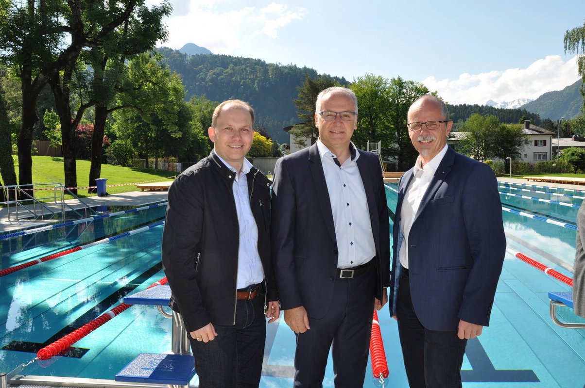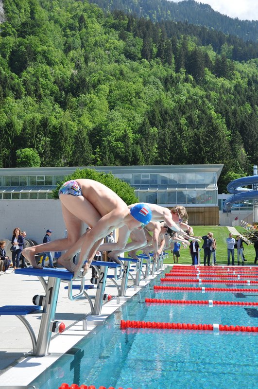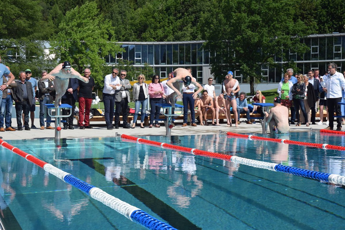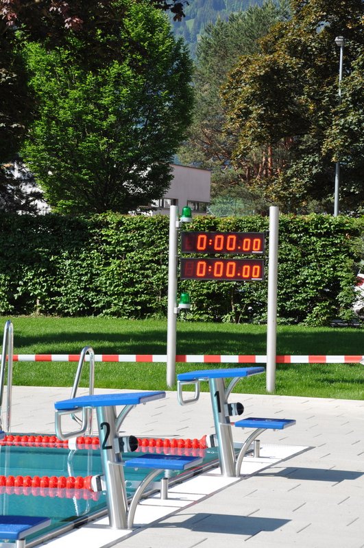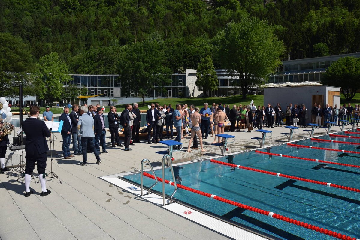 „Alles neu, alles besser und doch vieles beim Alten“, so beschreibt Bürgermeister Mandi Katzenmayer die Grundintention des Neubaus. Eines war dabei besonders wichtig: das 50-Meter-Sportbecken musste wettkampffähig erhalten bleiben bzw. ein Teil der neuen Anlage sein. Schließlich ist das Bludenzer 50-Meter-Becken nur eines von drei Wettkampf-Sportbecken in ganz Vorarlberg. „Der Schwimmwettkampf hat bei uns Tradition. Die jüngsten Erfolge unserer Top-Schwimmer und die Arbeit unseres Schwimmclubs zeigen, wie viel Potential in diesem Sport steckt. Dies gilt es natürlich zu fördern“, so Katzenmayer. Bei der offiziellen Eröffnung nutzten die Schwimmer des SC Val Blu Bludenz, unter ihnen auch Schwimmass Jan Niedermayer, so gleich die Gelegenheit, um das neue Sportbecken auszutesten. Die Sportler zeigten sich nach ihrem ersten Sprung ins kühle Nass von den neuen 50-m-Bahnen begeistert. Doch nicht nur die Profisportler werden mit dem 50-Meter-Becken ihre Freude haben. Eine Self-Timing-Anlage macht es auch für alle Hobbyschwimmer möglich, ihre Zeiten zu messen.