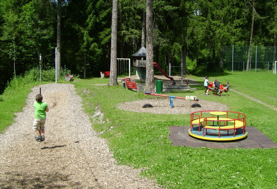 Der Spielplatz selbst bietet unendlich Platz für Abenteuer mitten im Grünen. Eine über 30m lange Seilbahn, ein Karussell, eine Schaukel und ein Spielhäuschen mit Rutsche gilt es zu entdecken. Für die kleineren Kinder gibt es einen beschatteten Sandspielbereich und Wipptierchen. Außerdem laden ein Kletterbaum und eine hohe Reckstange zum Turnen ein. Direkt gegenüber der Spielplatzfläche liegt der Tschutterplatz mit zwei richtigen Toren. Und wenn nach all dem Spielen und Tschuttern der große Durst kommt, kann man diesen beim angrenzenden Brunnen löschen. Genügend Parkbänke und schattenspendende Bäume laden zum Ausruhen und gemütlichem Beieinander sein ein.