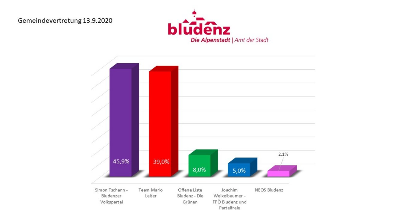 Die Gemeindevertretungswahl hat für Bludenz eine neue Zusammensetzung des Stadtparlamentes gebracht. Mit 2715 Stimmen oder 45,86 Prozent hat Simon Tschann mit der ÖVP 16 der insgesamt 33 Stadtvertretungssitze erobert. Das Team Mario Leiter kam auf 38,99 Prozent (das sind 2308 Stimmen) und somit auf 14 Sitze im Stadtparlament. Die OLB/Grüne brachten es auf 479 Stimmen (8,09 Prozent) und sind mit 2 Sitzen in der Stadtvertretung. Ein Mandat hat die FPÖ, das 293 Stimmen oder 4,95 Prozent. Die NEOS haben mit 125 Stimme (2,11 Prozent) den Einzug in die Stadtvertretung nicht geschafft.