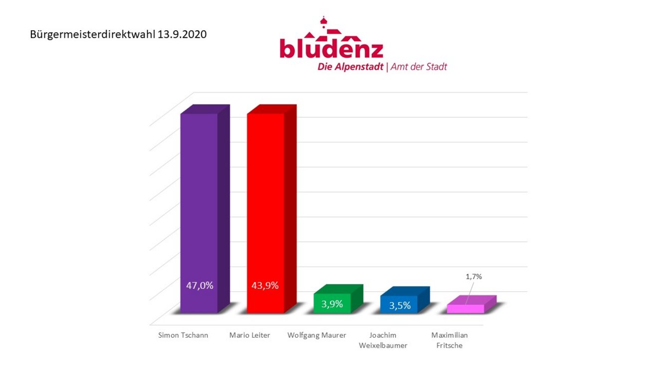 Bei der Bürgermeisterdirektwahl kam Simon Tschann auf 46,98 Prozent oder 2975 Stimmen. Mario Leiter erreichte 43,88 Prozentpunkte oder 2779 Stimmen. Weit abgeschlagen waren die Kandidaten der OLB, FPÖ und NEOS.