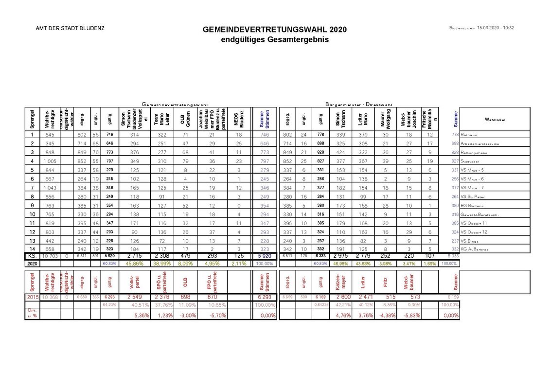 An der Bürgermeisterdirektwahl und Gemeindevertretungswahl beteiligten sich 6511 Bludenzerinnen und Bludenzer. Das entspricht einer Wahlbeteiligung von rund 61 Prozent.