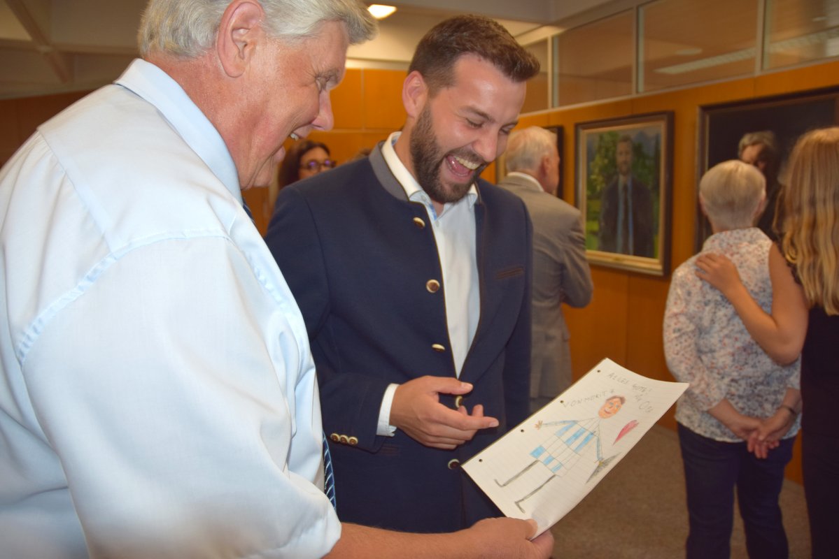 „Über 40 Jahre in der Bludenzer Kommunalpolitik so aktiv zu sein, schafft nicht jeder. Es wäre eine sehr lange Liste, wenn ich all seine Verdienste aufzählen würde. Aber eines wollte Mandi ja nie – nämlich lange Reden. Um Altbürgermeister Katzenmayer aber nicht nur mit diesem Bild zu würdigen, werde ich im Herbst der Stadtvertretung vorschlagen, Mandi Katzenmayer die Ehrenbürgerschaft der Stadt Bludenz zu verleihen“, kündigte Bürgermeister Simon Tschann anlässlich der Bildenthüllung an. „Bitte überlegt euch da nochmals. Es war eine Vielzahl von Personen und vor allem ein gutes Team im Rathaus, das mich immer bei meiner Arbeit bestens unterstützt hat“, gab der Altbürgermeister zu bedenken.