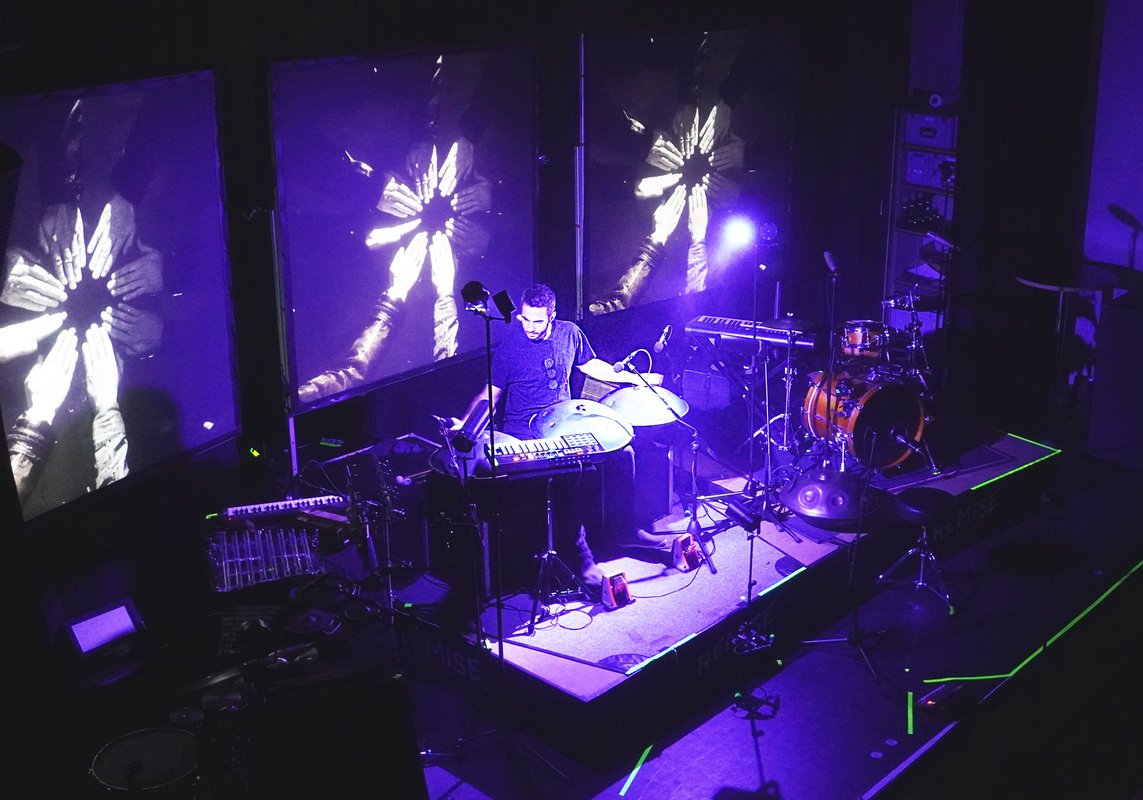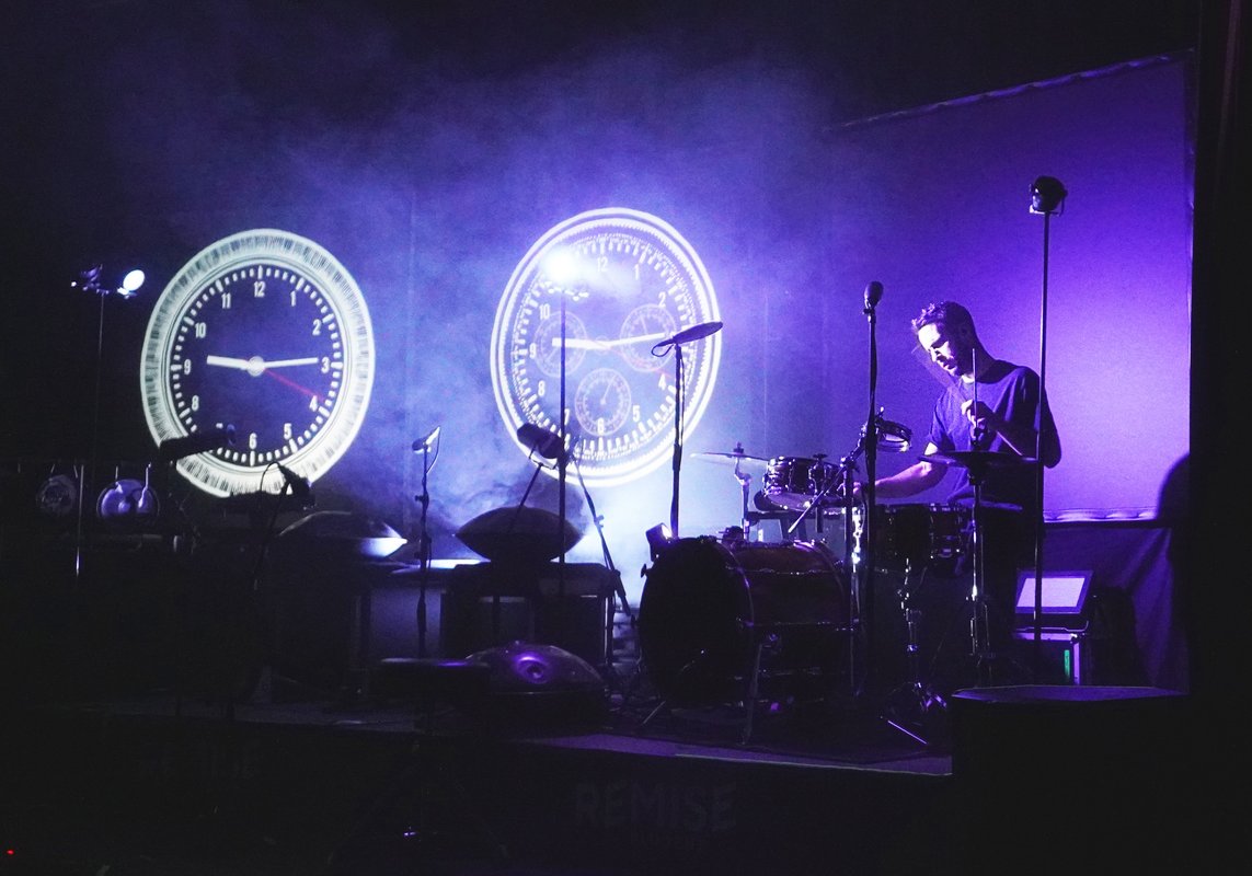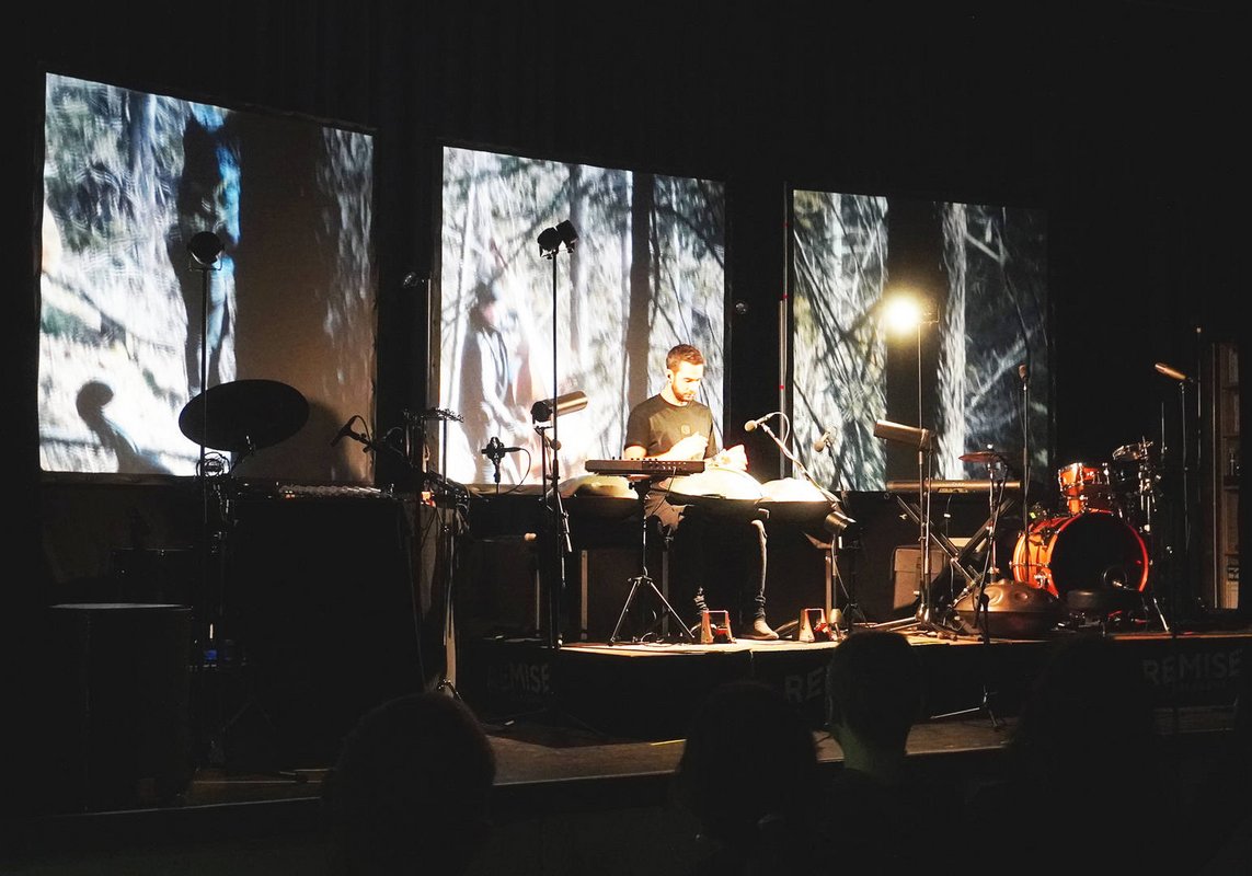 Die Verbindung von natürlichen Klängen aus unserer Umwelt zusammen mit technologischen Bässen und Beats überzeugte das Remise-Publikum schnell. Die zarten, spielerischen Töne des schweizer Blechklanginstruments Handpan beschallten den Saal und faszinierende Visualisierungen mit natürlichen Sounds wurden auf Leinwänden präsentiert. Kompositionen mit beispielsweise dem tiefen Quaken eines Frosches, Wassertropfen und Popcorn machten die One-Man-Show besonders vielfältig.