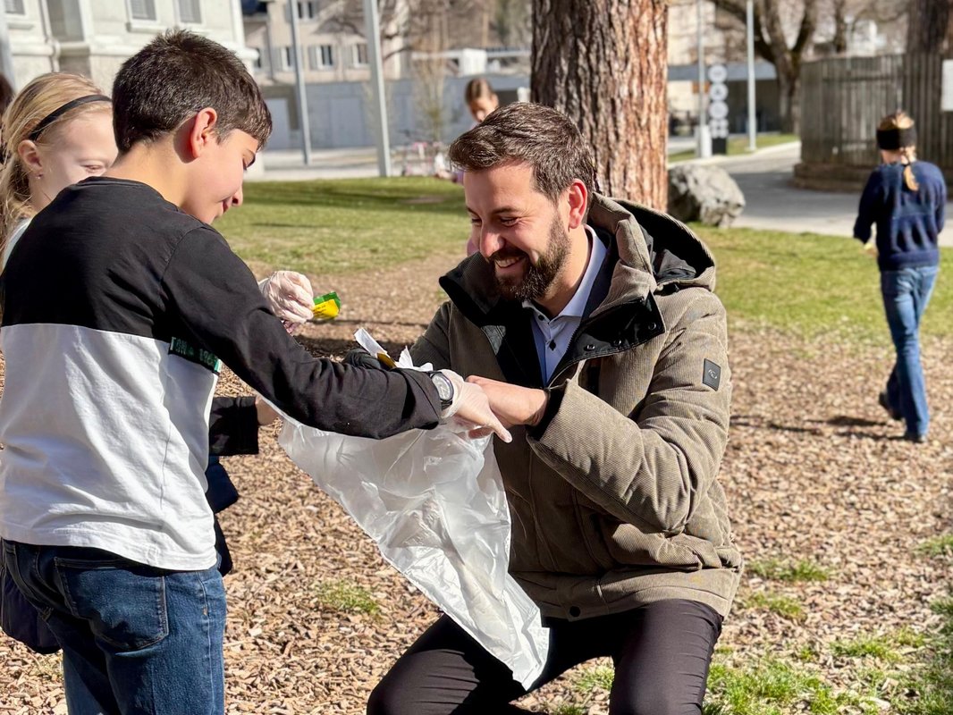 Im Anschluss an das Gespräch sammelten die Kinder gemeinsam mit den Gästen rund um die Schule Müll. Diese Aktion gehört für die vierten Klassen bereits zum Schulalltag: Mehrmals pro Woche treffen sie sich, um achtlos entsorgten Müll einzusammeln und so das Bewusstsein für Umwelt und Natur zu stärken.