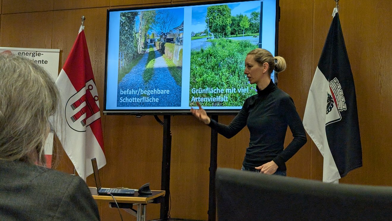 Beim Vortrag „Einfach entsiegeln“ im Rahmen der Veranstaltungsreihe „Umwelt im Gespräch“ im Bludenzer Rathaus zeigte Kerstin Riedmann vom Verein für Bodenfreiheit im Rahmen des Projekts „BODAguat“, wie versiegelte Flächen einfach in Grünräume umgewandelt werden können.