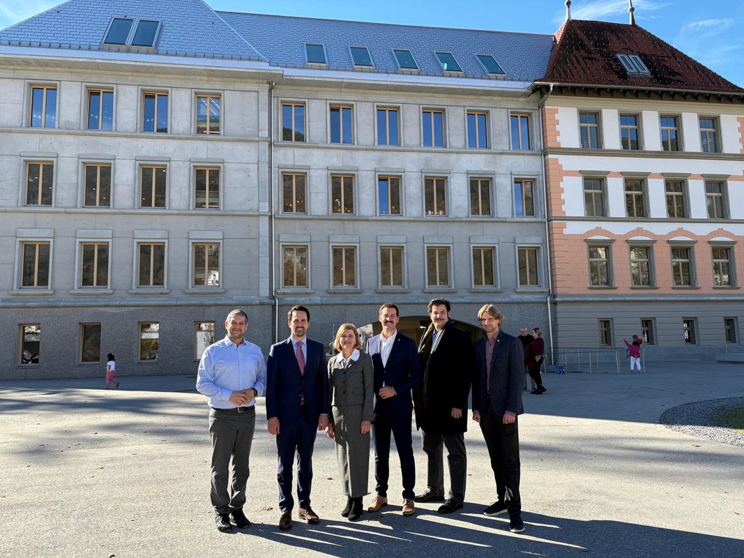 Bildunterschrift: Direktor Simon Hagen, Bundesminister Christoph Wiederkehr, Bildungslandesrätin Barbara Schöbi-Fink, Bürgermeister Simon Tschann, Stadtrat Cenk Dogan und Stadtrat Bernhard Corn (v. l. n. r.)