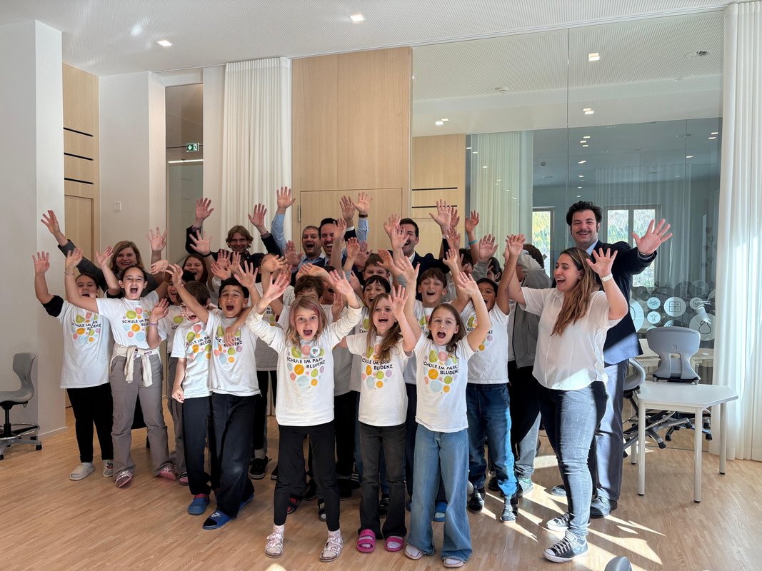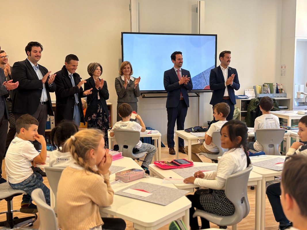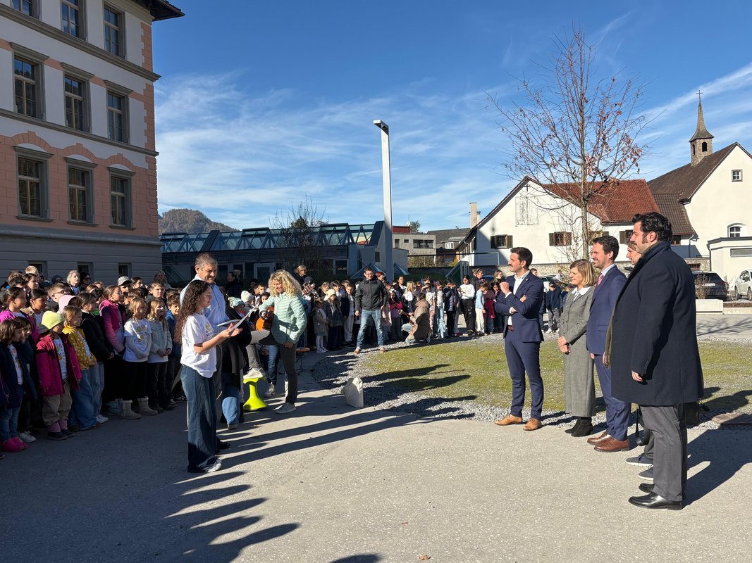 „Die Schule im Park ist ein echtes Vorzeigeprojekt, das zeigt sich nicht nur in der Architektur sondern auch beim Betreten der Klassenräume. Die Kinder fühlen sich im neu geschaffenen Lernumfeld einfach wohl“, betonte Bürgermeister Simon Tschann beim Besuch des Bildungsministers in der „Schule im Park“.