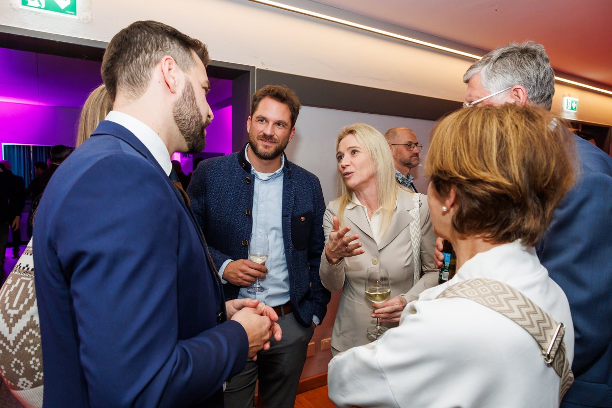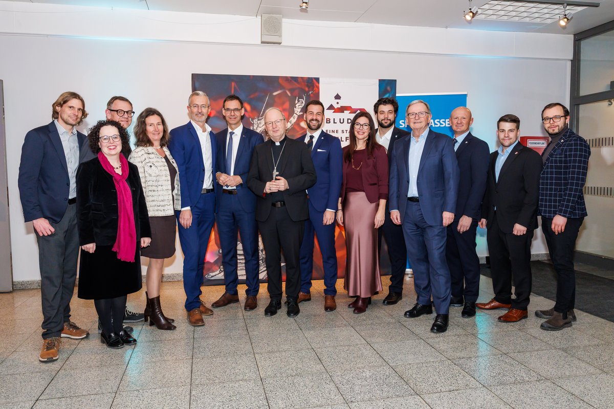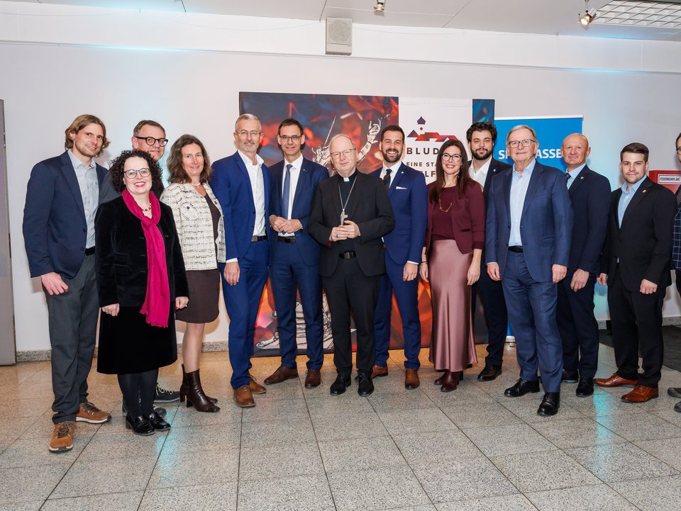 Bildunterschrift: Landeshauptmann Markus Wallner, Bischof Benno Elbs, Bürgermeister Simon Tschann und Plettenbergs Bürgermeister Ralf Beßler im Austausch mit zahlreichen Vertreter:innen aus Stadt, Land und Bund.