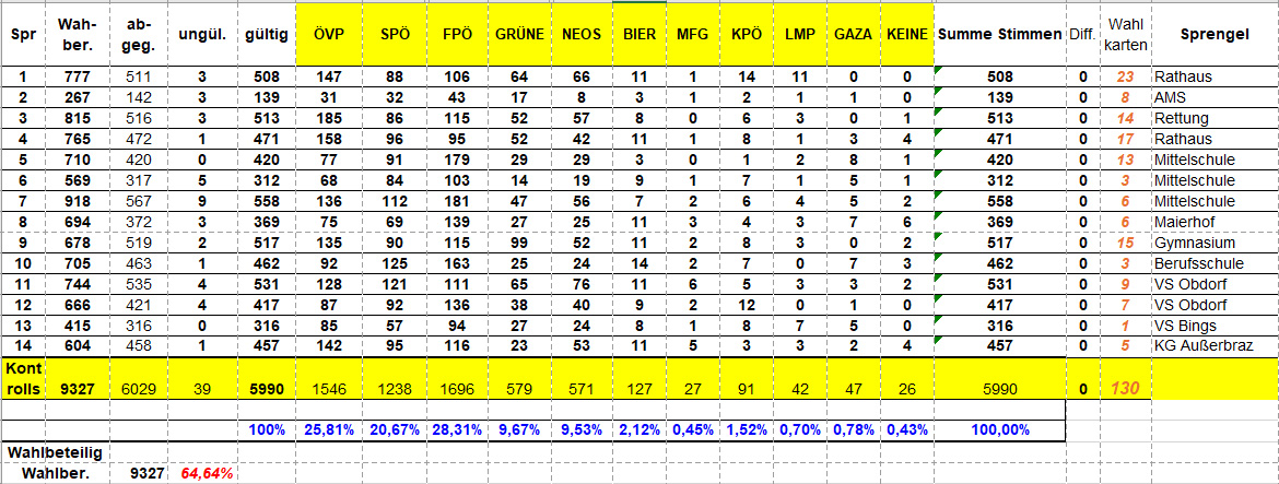 Die Bludenzer Wahlsprengel sind ausgezählt. Insgesamt 6.092 Bludenzer*innen haben ihre Stimme abgegeben. Das entspricht einer Wahlbeteiligung von 64,64 Prozent. Hier geht es zum Ergebnis nach Wahlsprengel in Bludenz.