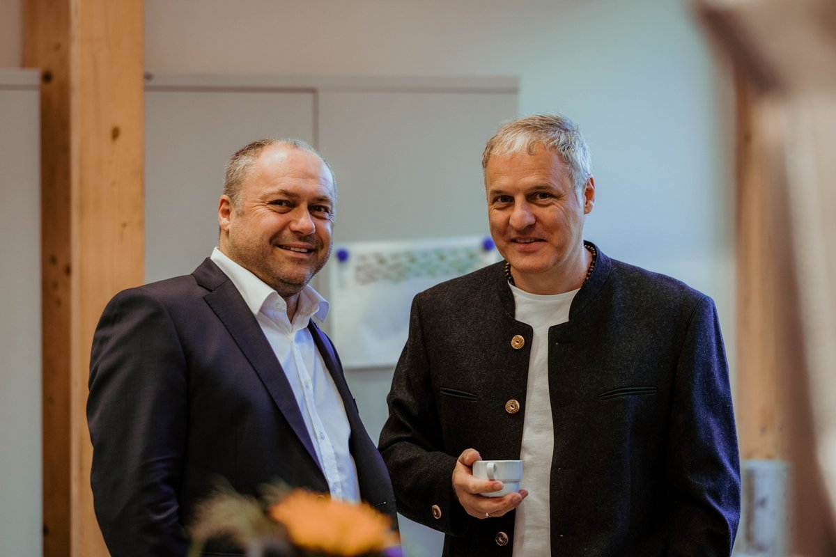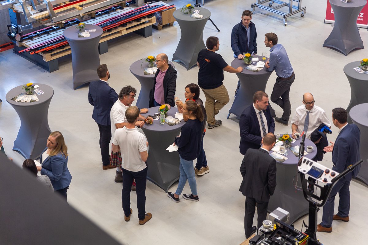 Im Anschluss nutzten die Anwesenden das morgendliche Zusammentreffen um miteinander ins Gespräch zu kommen, so etwa Dieter Bitschnau vom onlinedekor, Hotelinhaber Sandro Preite und Alpenregion-Geschäftsführerin Kerstin Biedermann-Smith. Das Treffen zum Austausch nutzten auch Adriane Vonbank von der WOHNWerkstatt Vonbank sowie Beatus Fleisch von Primus Immobilien in Bludenz. Von Seiten der Stadt Bludenz genossen Vizebürgermeisterin Eva Peter, Stadträtin Martina Brandstetter sowie Stadtrat Cenk Dogan die entspannte Atmosphäre in der großen Produktionshalle.