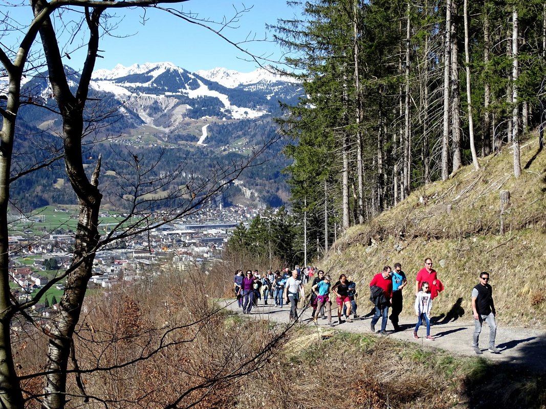 Zahlreiche Naturbegeisterte nutzen die frühlingshaften Temperaturen, um der Eröffnung des neuen Rastplatzes beizuwohnen. In einer rund einstündigen Wanderung wurden die TeilnehmerInnen dabei zunächst von Stadtförster Werner Vergut über den revitalisierten Wanderabschnitt vom Hellwald bis zum Grubser Tobel geführt. Im Anschluß erwartet die BesucherInnen dann die offizielle Einweihung der neuen „Klang-Rast-Stätte“. Mit einem kleinen Festakt, dem u.a. Bürgermeister Mandi Katzenmayer, Alfons Feuerstein (Obmann des Vereins für Toursimus und Freizeit), Hanno Fuchs (WIGE Bludenz) sowie die Architekten Markus Ender und Cornelia Vonbun und Tischlermeister Martin Neyer beiwohnten, wurde der neue, speziell für Familien mit Kindern konzipierte Rastplatz eröffnet.