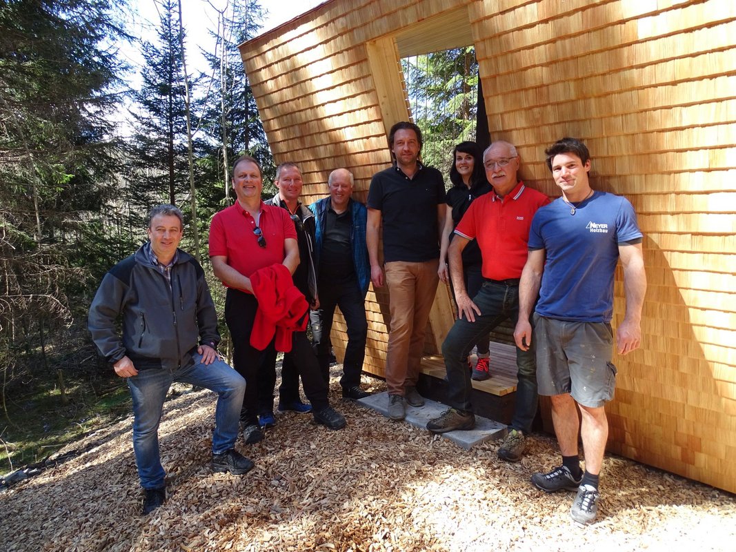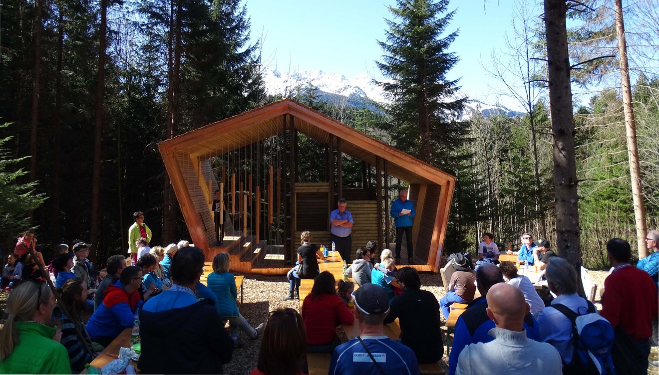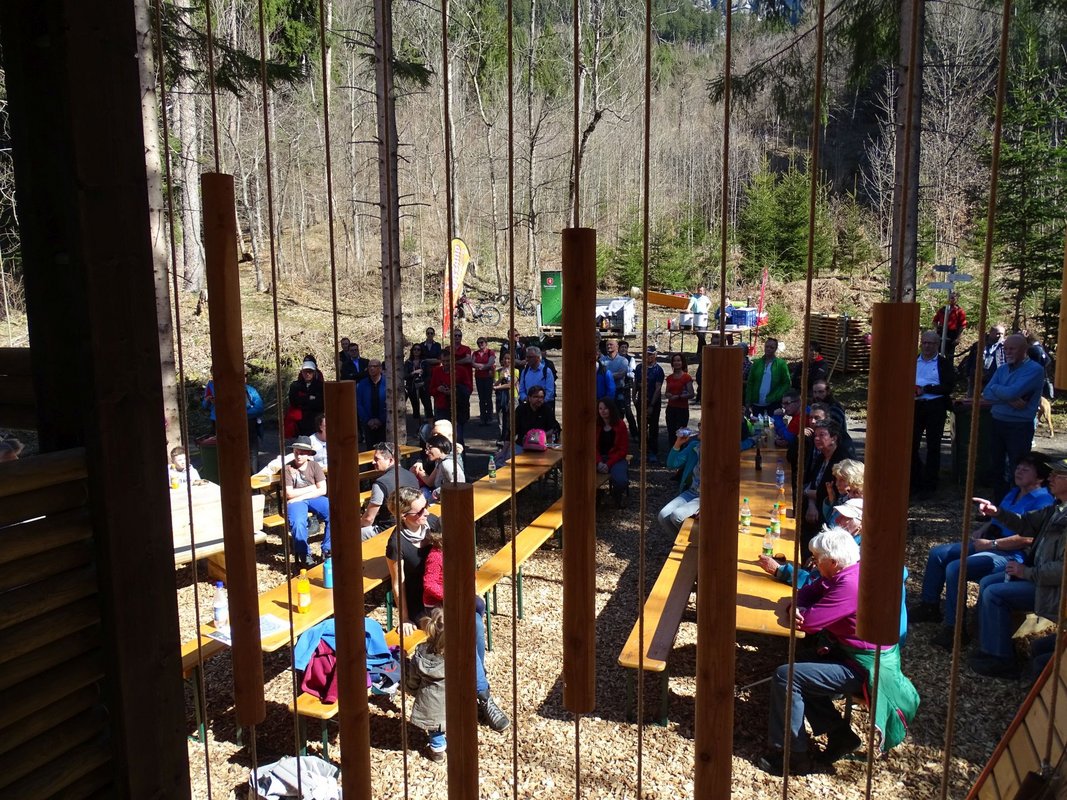 Bei traumhaftem Frühlingswetter wurde am vergangenen Samstag der sanierte Wanderweg zwischen Hellwald und Grubsertobel eröffnet. Besonderes Highlight bildete dabei die neu errichtete „Klang-Rast-Stätte“.