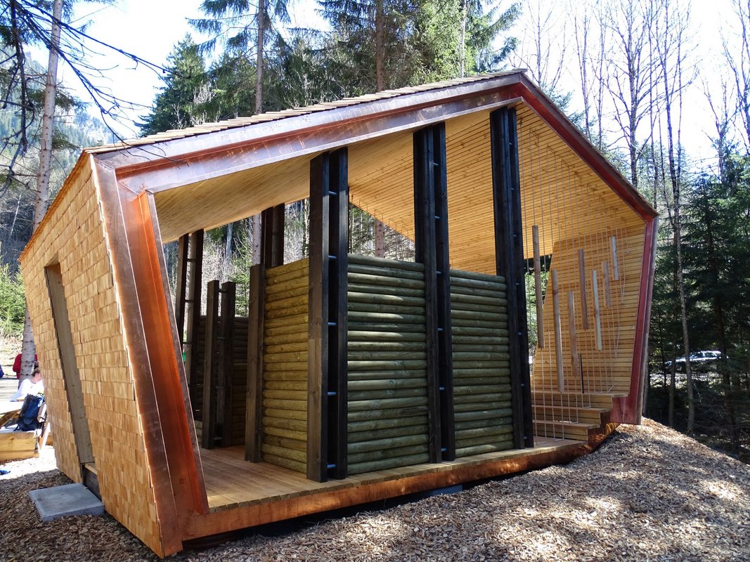 Die „Klang-Rast-Stätte Hellwald“ schafft eine Verbindung von Natur und Abenteuer. Die Holzkonstruktion passt sich in ihrer organischen Bauweise der umliegenden Landschaft an und spiegelt in ihrer Formgebung die Bludenzer Bergwelt wider. Der Innenraum ist in drei Bereiche gegliedert: eine aktive Zone, einen Ruhebereich und einen Klangraum. Im ersten Bereich können Rundhölzer zwischen Stützen gestapelt werden. Die flexibel gestalteten Bauteile im Inneren lassen dabei eine unendliche Vielzahl an baulichen Anordnungen zu. Ob damit ein zusätzlicher Raum geschaffen wird oder im Inneren der Klang-Rast-Stätte ein Labyrinth entsteh: Der Fantasie sind keine Grenzen gesetzt. Der Ruhebereiche mit seinen Sitzstufen lädt zum Rasten und Verweilen ein. Das in der Raststätte integrierte Holzklangspiel verwandelt den Raum in ein Musikinstrument. Entworfen und geplant wurde die Klang-Rast-Stätte von der Architektin Cornelia Vonbun (Atelier Ender, Nüziders). Die bauliche Umsetzung erfolgte durch Holzbau Neyer (Rungelin, Bludenz).