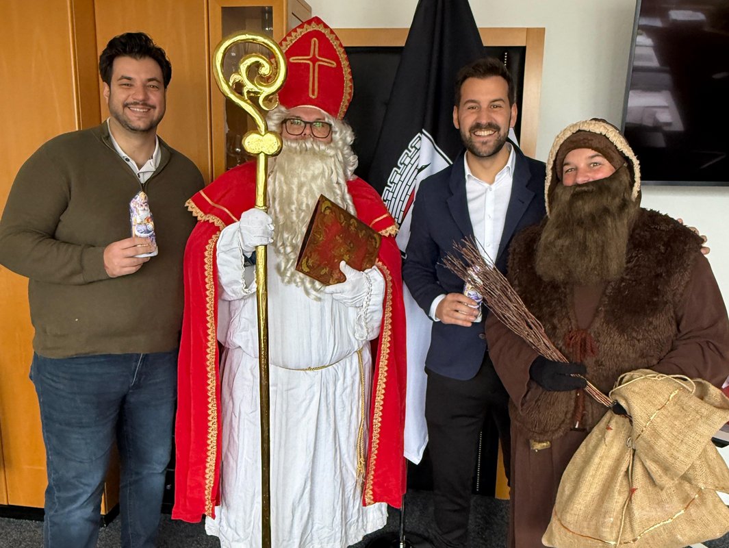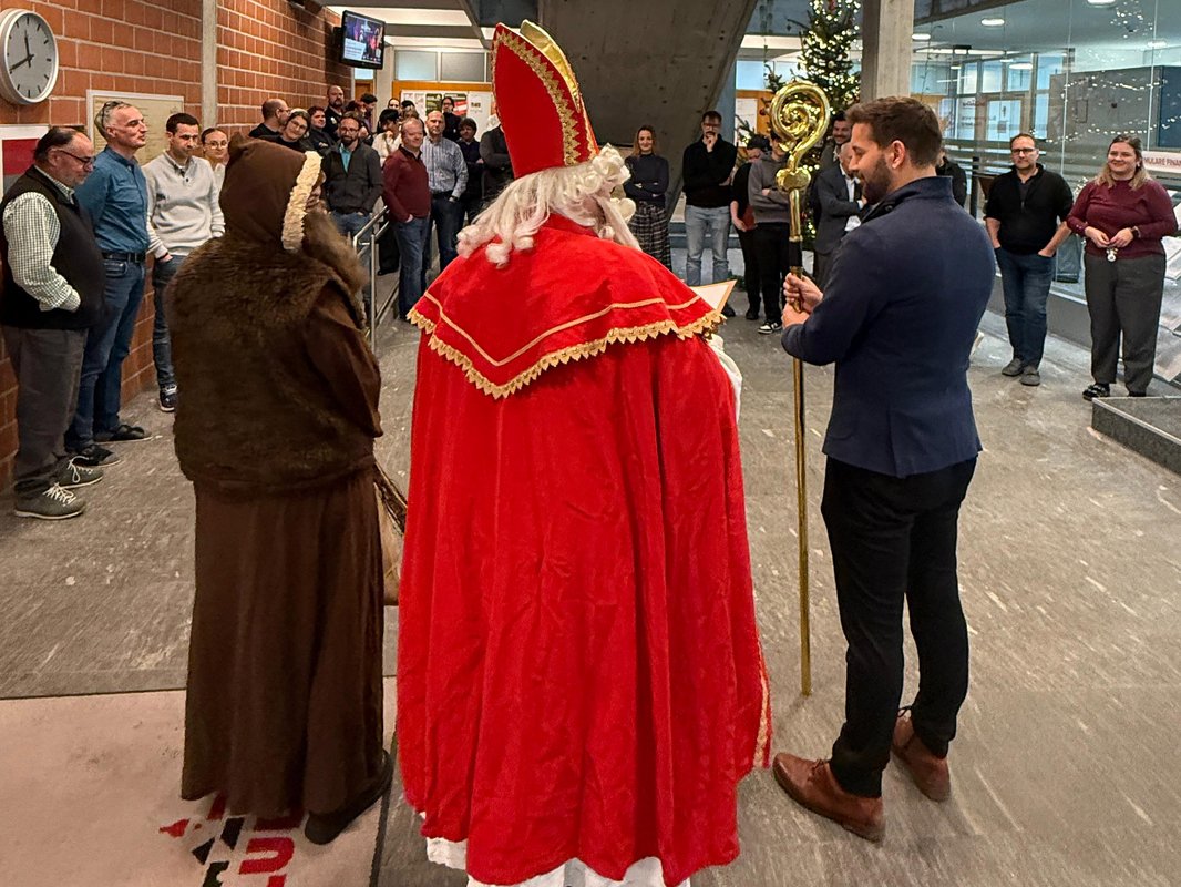 Nicht nur Kinder freuen sich über den Besuch des heiligen Nikolaus – auch im Rathaus Bludenz verbreiteten der Nikolo und sein treuer Begleiter Knecht Ruprecht festliche Stimmung. Bei ihrem Besuch im Bürgerservice und in den Büros überraschten sie Bürger*innen und Mitarbeiter*innen mit einem Schokohasen des Bludenzer Unternehmens Mondelez voller kleiner Leckereien.