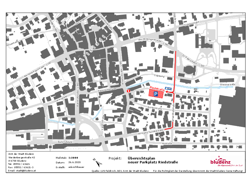 Mit der Fertigstellung der Parkplätze in der Herrengasse sind die stadtseitigen Vorbereitungen zum Baubeginn des neuen Jägerbau-Firmensitzes in Bludenz abgeschlossen. Die Parkflächen in der Herrengassen werden vor allem für Dauermieter bereitgestellt. Daher hat die Stadt Bludenz für den Zeitraum der bevorstehenden Bauarbeiten 80 zusätzliche Parkplätze eingerichtet. Die vorübergehenden Parkflächen befinden sich in direkter Zentrumsnähe in der Riedstraße. Der Anfahrtsweg zu diesen Ersatzparkplätzen ist bereits ausgeschildert.
