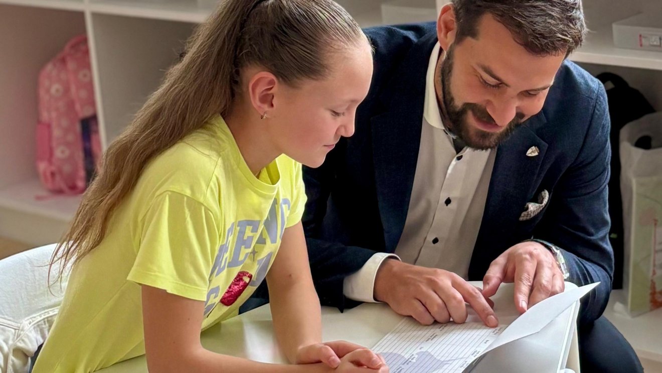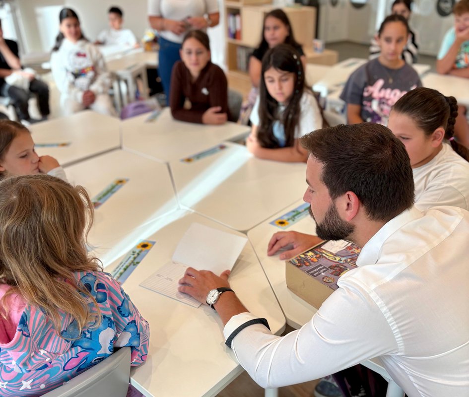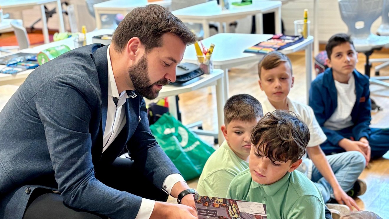 Bildunterschrift: Bürgermeister Simon Tschann überraschte die Kinder zum Schulbeginn mit einer ganz besonderen Version des beliebten Spiels „Stadt, Land, Fluss“.
