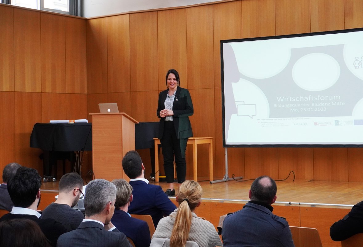 In den letzten Monaten fanden zahlreiche Beteiligungsformate mit Bürger*innen der Stadt Bludenz, Kindern und Jugendlichen statt. Einen Nachmittag lang luden die Projektverantwortlichen zum 1. Bludenzer Wirtschaftsforum im Rahmen des Projektes in den Saal im Schulpark ein. Zahlreiche Unternehmer*innen, Wirtschaftstreibende, Fachpersonen aus Bildungseinrichtungen und die politischen Verantwortlichen der Stadt Bludenz ließen sich nach den Begrüßungsworten von Landtagsvizepräsidentin Monika Vonier und Bürgermeister Simon Tschann vom Moderator*innenteam (Cordula Kreidl und Bertram Strolz) über den aktuellen Projektstand informieren. Kriemhild Büchel-Kapeller (Amt der Vorarlberger Landesregierung – Büro für freiwilliges Engagement und Beteiligung) verdeutlichte im Rahmen ihres Vortrages „Mut für Zukunft“ die Herausforderungen im Bildungsbereich und die Bedeutung von Bildung und Wirtschaft in einer Welt des Wandels.