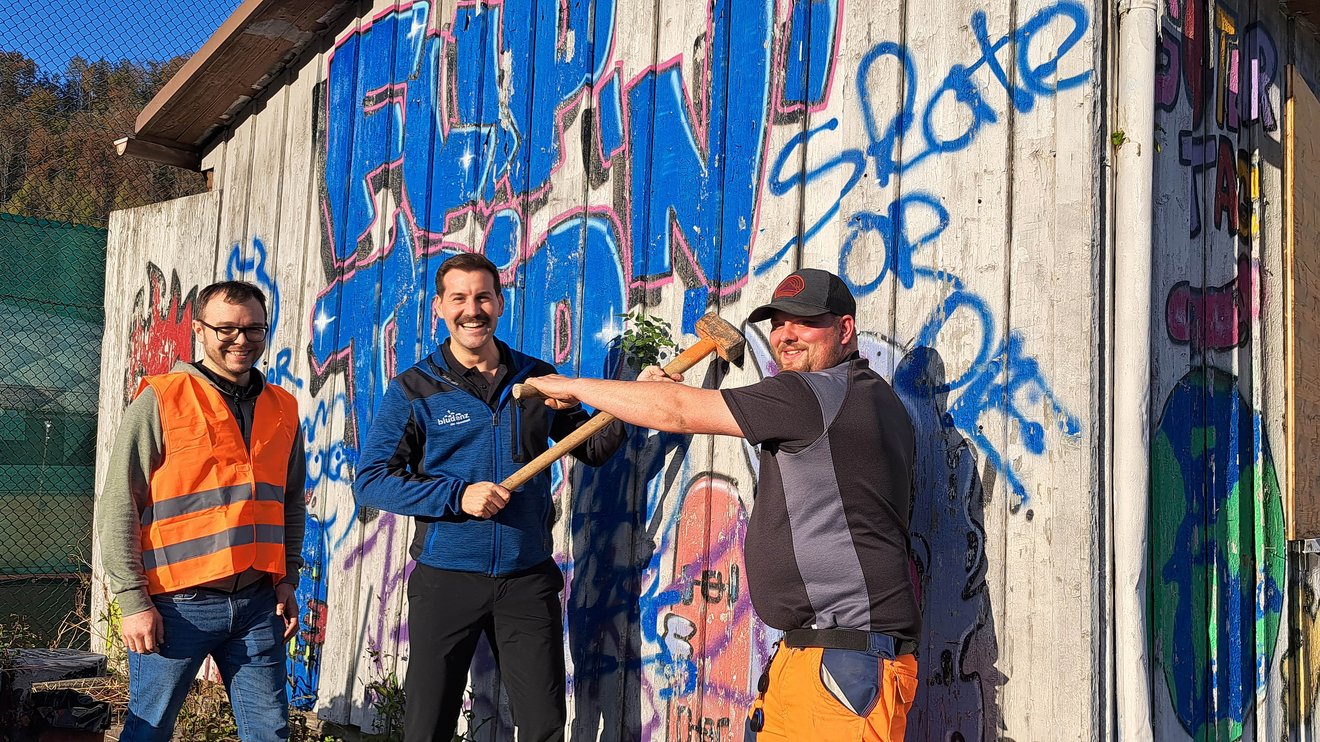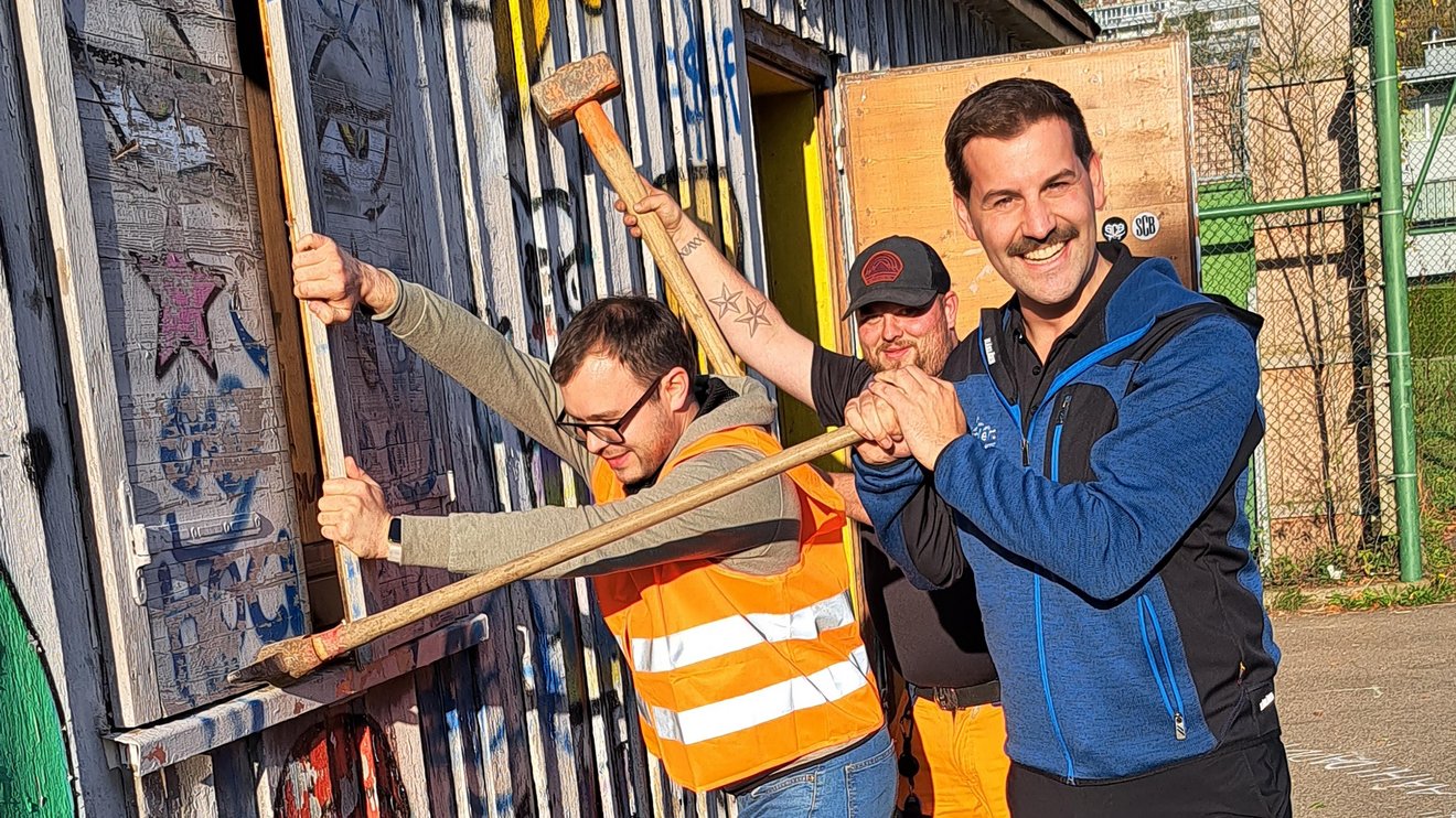 Bürgermeister Simon Tschann und Jugendstadtrat Andreas Fritz Wachter legten bei den Abrissarbeiten für den neuen Freizeit- und Jugendpark gerne selbst Hand an.