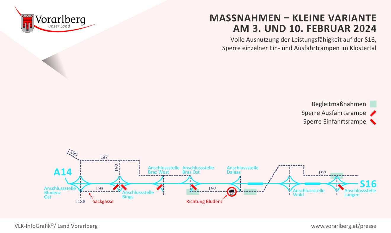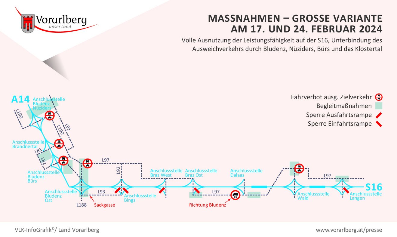 Konkret sind am 17. und 24. Februar 2024 neben den bei der „kleinen Variante“ aufgezählten Maßnahmen Durchfahrtsverbote für den überregionalen Verkehr („Fahrverbot für alle Kraftfahrzeuge - ausgenommen Zielverkehr Bezirk Bludenz) von 8 bis 18 Uhr an folgenden Stellen geplant: