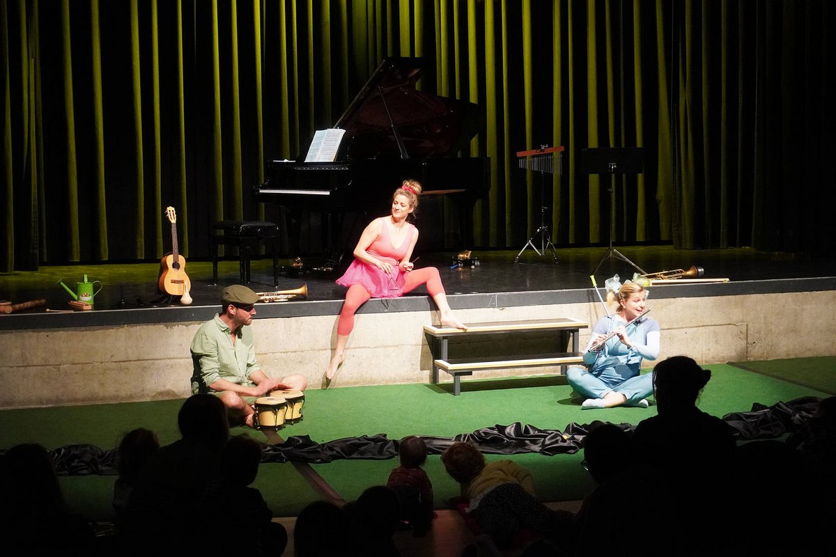 Unter dem Titel „Spielen auf der Blumenwiese“ startete die Kleinkinderkonzertreihe am Dienstag, 22. März, um 14 und ein weiteres Mal um 16 Uhr, mit zwei restlos ausverkauften Vorstellungen in die nächste Runde. Diesmal kreuchte und fleuchte, klackte und knackste, summte und brummte es beim Konzert in der Remise. Und die junge Zuhörerschaft zeigte sich begeistert: Tanzen, Mitsingen, Klatschen und neugieriges Ausprobieren der Instrumente stand auf dem Programm. Auf der Bühne warteten summende Bienchen, singende Frösche, klingelnde Gänseblümchen, hustende Regenwürmer und tanzende Fische, die von den kleinen Besucher*innen begeistert entdeckt wurden. Das Trio „Pfiffikus“ ließ mit verschiedenen musikalischen Stilrichtungen und Genres nicht nur das junge Publikum mittanzen.